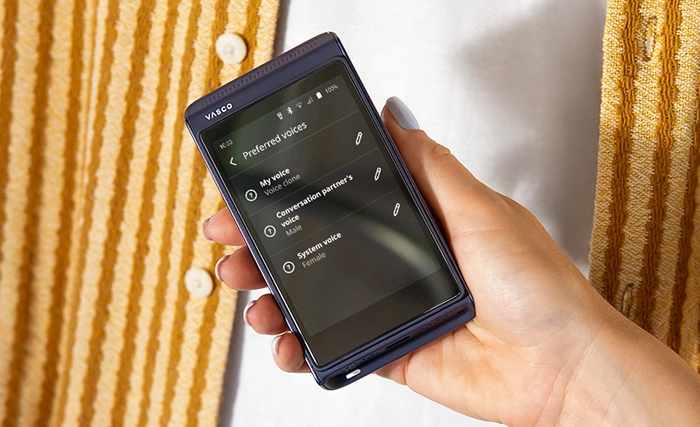 Pour ceux qui aiment avoir le choix. En plus de la fonctionnalité révolutionnaire Vasco My Voice, vous pouvez choisir entre des voix de synthèse masculines ou féminines. Cela vous permet d'adapter le ton à toutes les situations. Vous préférez un ton formel pour les réunions d'affaires, ou quelque chose de plus chaleureux pour les conversations en famille ? C'est votre traducteur, vos règles.